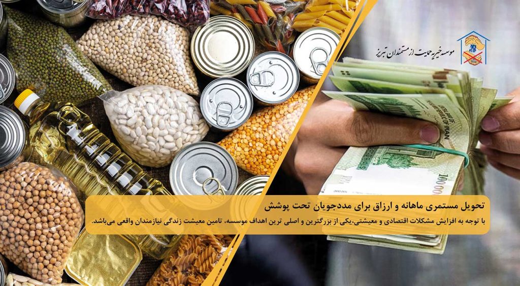 مددجویان تحت پوشش در موسسه خیریه حمایت از مستمندان تبریز با توجه به تعداد تحت تکفل از سبد کالای نان – حبوبات مختلف – گوشت گوسفند ،گوشت مرغ ، لوازم بهداشتی را از موسسه دریافت میدارند.
