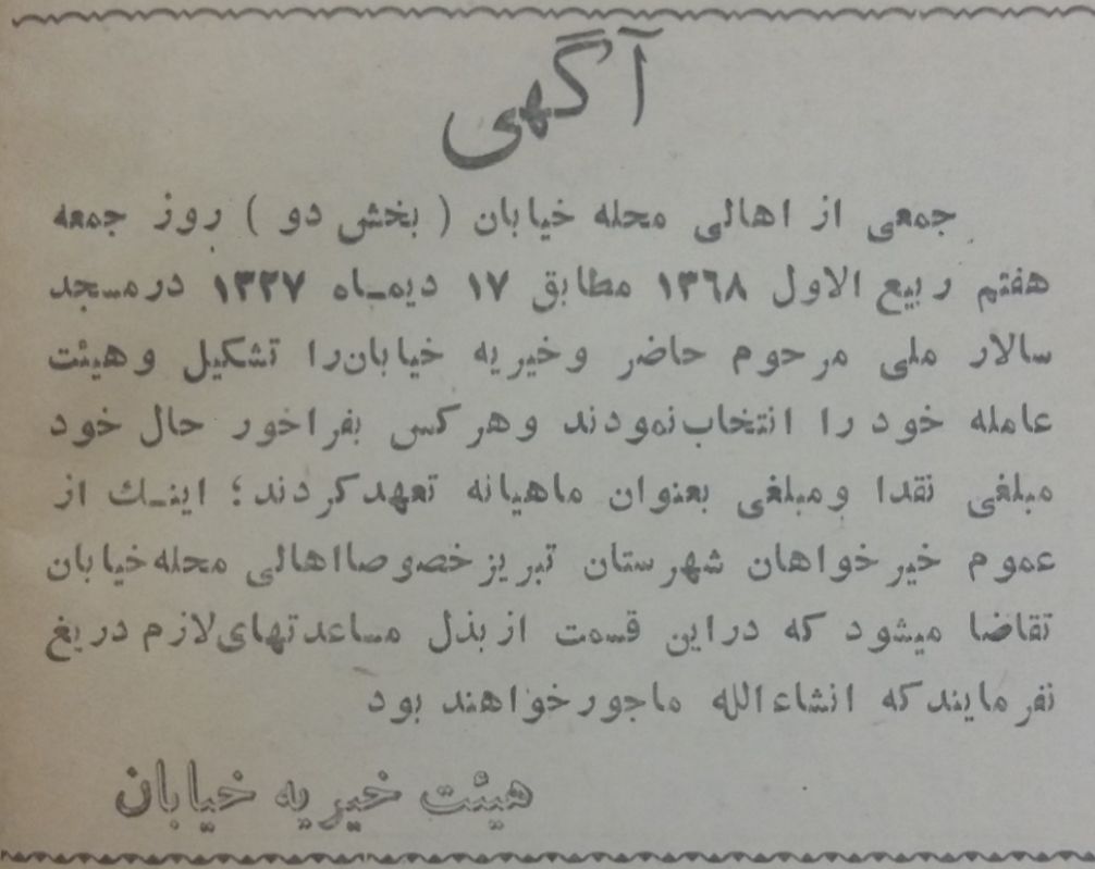 اگهی تاسیس انجمن خیریه محله خیابان- سال 1327 شمسی