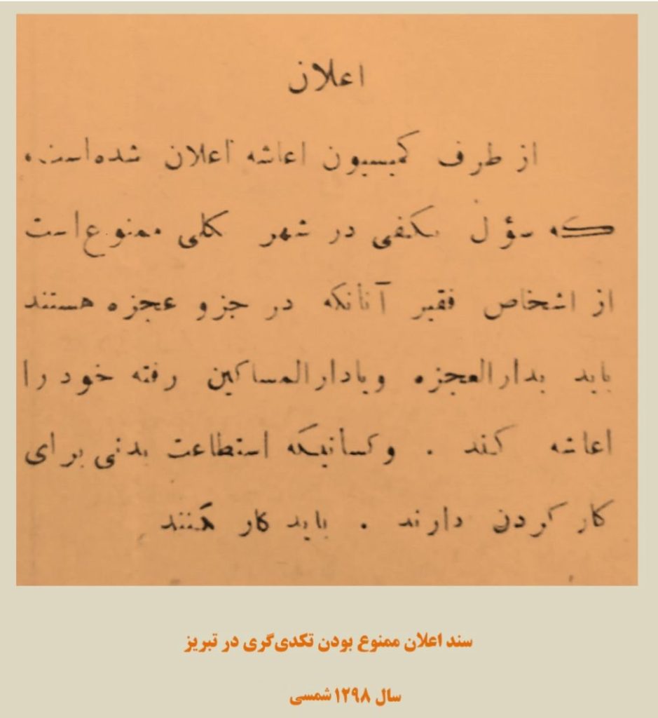 *در سند فوق و پایینی به گدایان اخطار داده شده که تکدی‌گری در تبریز ممنوع اس و هر کس توانایی کار کردان داشته باشد به آنها کار داده می شود و هر کس علیل و از کار افتاده باشد، آنها به دارالعجزه(محلی که حاجزان را نگهداری می‌کنند) فرستاده می شود و جای هیچ بهانه‌ای برای فعالیت تن پروان و گدایان باقی نمانده است.