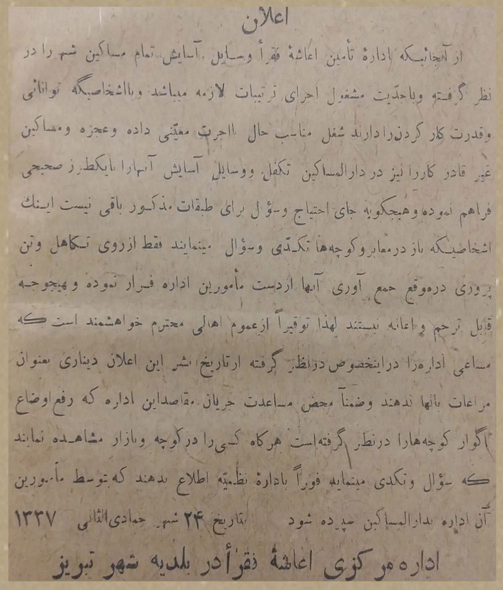 از آنجائیکه اداره اعاشه فقراء(تامین معیشت نیازمندان) وسایل تمام ساکنین شهر را در نظر گرفته و با جدیت مشغول اجرای ترتیبات لازمه میباشد و با اشخاصیکه توانایی و قدرت کار کردن را دارند شغل مناسب حال با اجرت(حقوق) معینی داده و عجزه و مساکین(ناتوان و بینوایان) غیر قادر کار را نیز در دارالمساکین(محل نگهداری از نیازمندان) تکفل و وسایل آسایش آنها را با یک طرز صحیحی فراهم نموده و هیچگونه جای احتیاج و سوّال برای طبقات مذکور باقی نیست اینک اشخاصیکه باز در معابر و کوچه های تکدّی(گدایی) و سوّال مینمیاند فقط از روی تکاهل (تنبلی)و تن پروری در موقع جمع‌آوری آنها از دست مامورین اداره فرار نموده و بهیجوجه قابل ترحم و اعانه(کمک) نیستند. لهذا توقیراً از عموم اهالی محترم خواهشمند است که مساعی اداره را دراین خصوص در نظر گرفته از تاریخ نشر این اعلان دیناری بعنوان مراعات بآنها ندهند و ضمناً محض مساعدت جریان مقاصد این اداره که رفع اوضاع ناگوار کوچه ها را در نظر گرفته است هرگاه کسی را در کوچه و بازار مشاهده نمایند که سوّال و تکدی مینماید فوراً باداره نظمیه اطلاع بدهند که بتوسط مامورین آن اداره بدارلالمساکین سپرده شود.